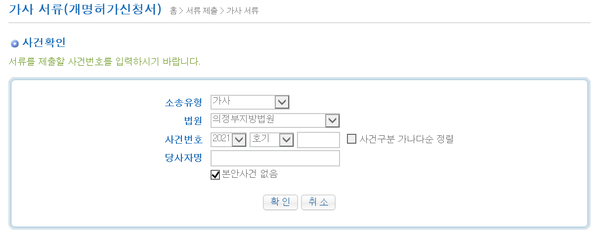 화면 가운데 보이는 개명허가신청서를 클릭합니다. 그러면 다음의 화면이 보입니다. 해야 할 것은 먼저 주민등록등본에 나와 있는 자신의 거주지에 따른 법원을 선택하세요. 그리고 본안사건 없음을 클릭하고 확인을 눌러주세요.