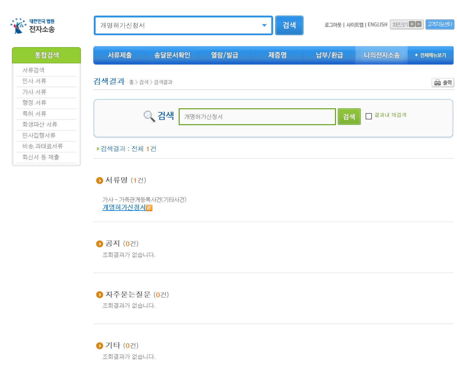 아이디와 공동인증서를 통해 로그인을 한 뒤에 다음과 같이 검색창에서 개명허가신청서를 검색합니다.