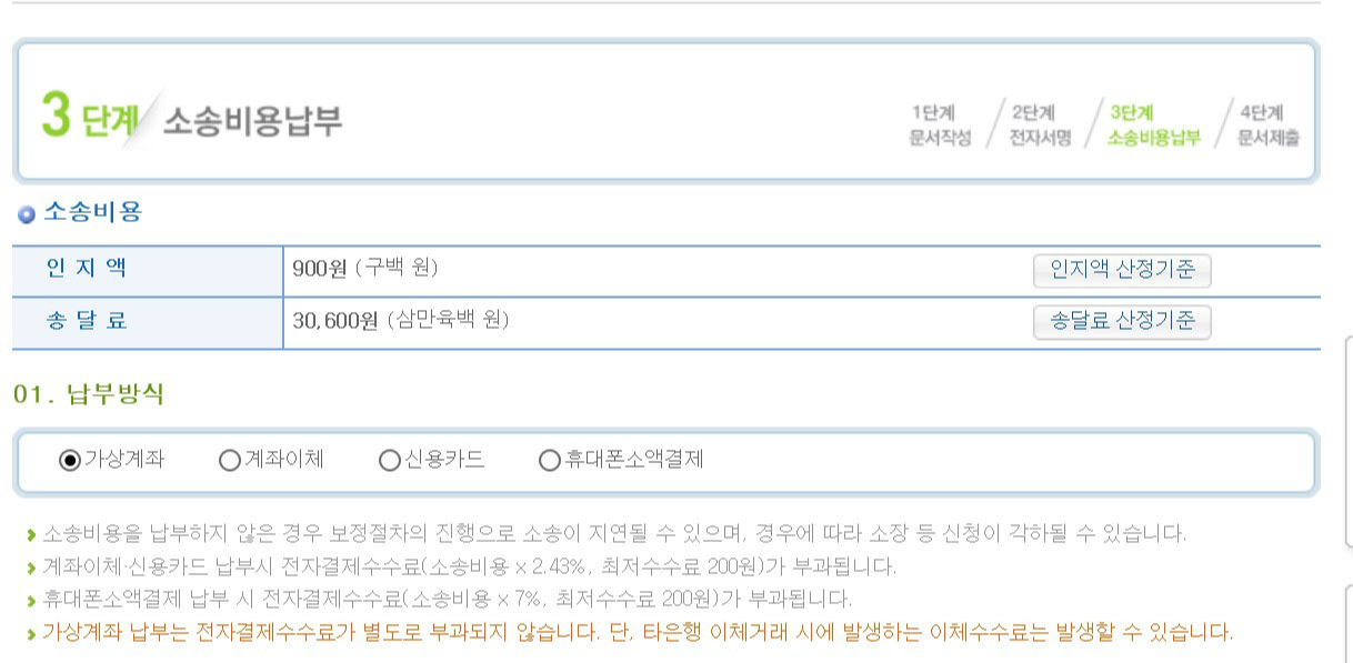 그리고 이제는 3단계 소송비용 납부입니다. 수수료를 내지 않으려면 꼭 가상계좌로 납부를 하세요. 나머지는 모두 수수료가 있습니다. (참고로 법원에 직접 가서 신청을 할때도 현금을 준비하세요! 카드 납부는 수수료가 있습니다.)