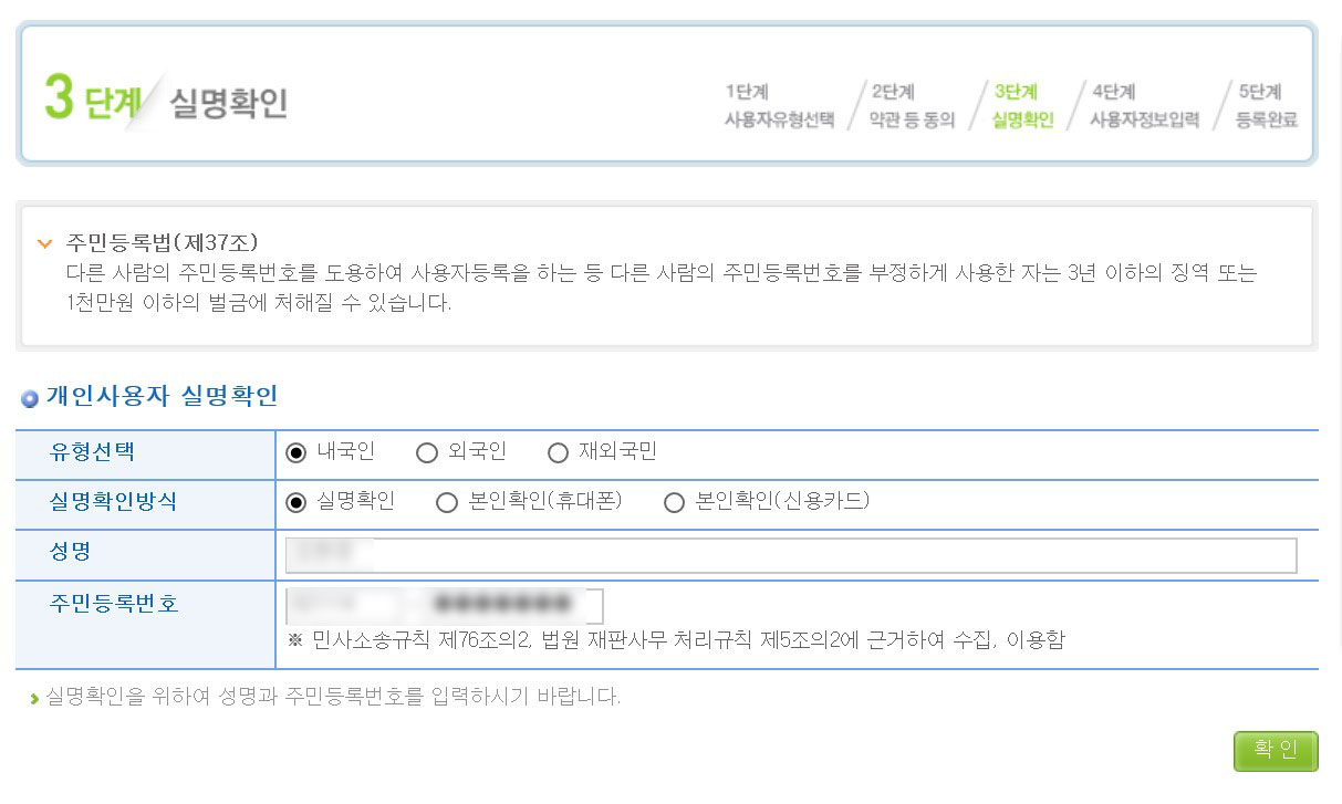 다음으로 실명확인을 하셔야 하는데, 주민등록번호로 하시면 공동인증서가 필요합니다.