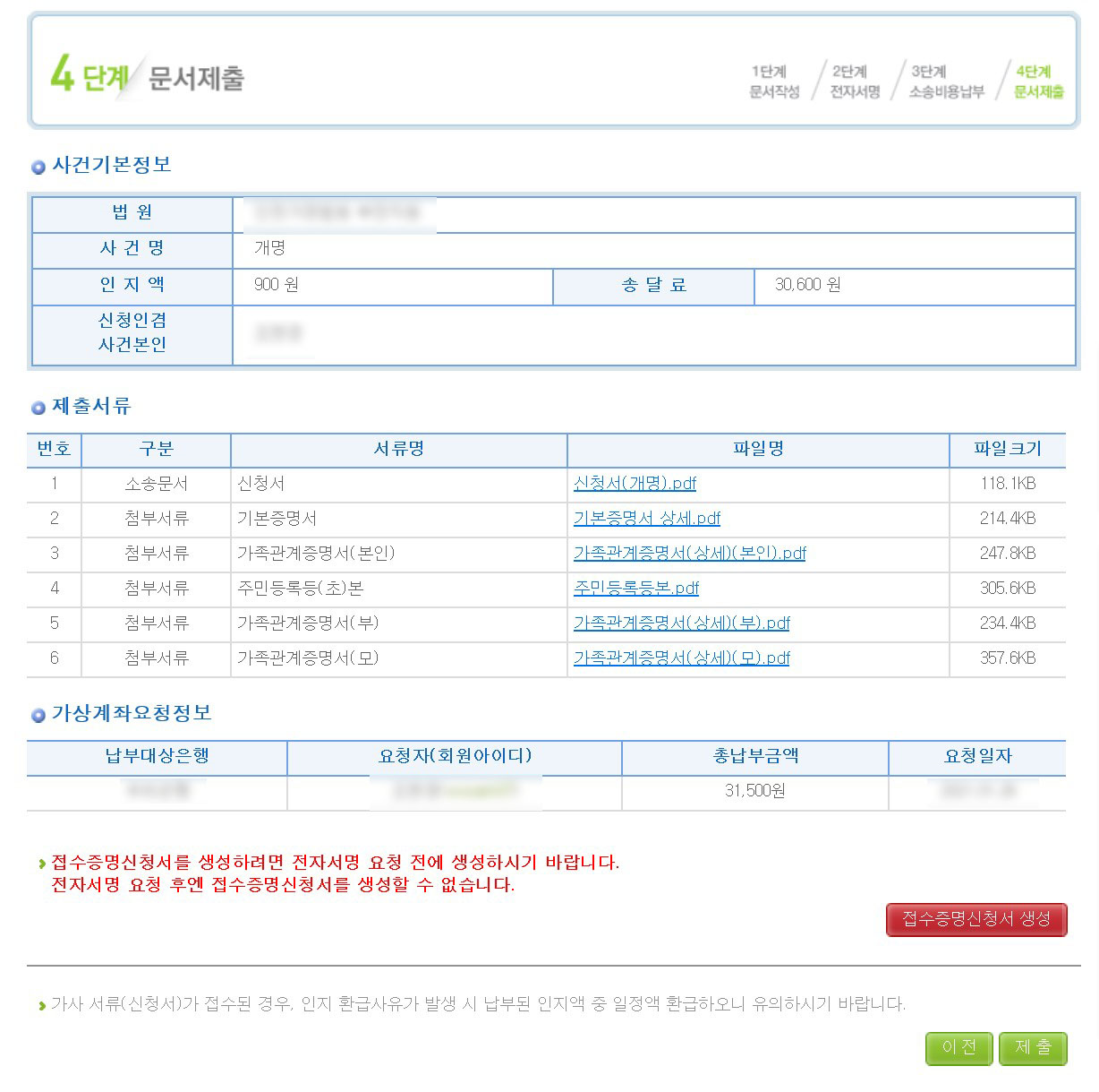 4단계 문서제출 화면에서 접수증명신청서 생성을 하면 버튼이 빨간색에서 초록색으로 바뀝니다. 원하는 통수 기입을 하고 제출을 눌러주세요. 그러면 아래와 같이 신청서 접수 완료 화면이 나옵니다. 그러면 가상계좌 은행과 번호를 확인하고 금액을 납부해주세요.