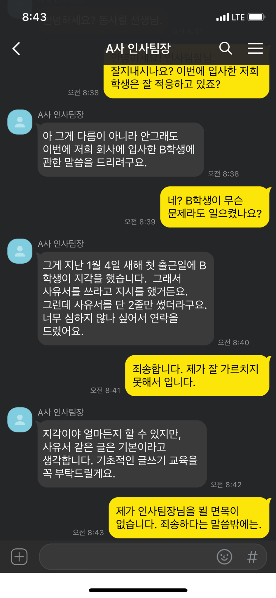 저의 제자인 B학생이 입사한 C회사의 A인사팀장님으로부터 아래와 같이 연락이 왔습니다.
