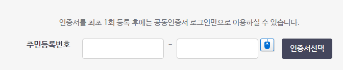 주민번호 입력을 통한 등록 후에 공동인증서 로그인을 해주시면 됩니다.
