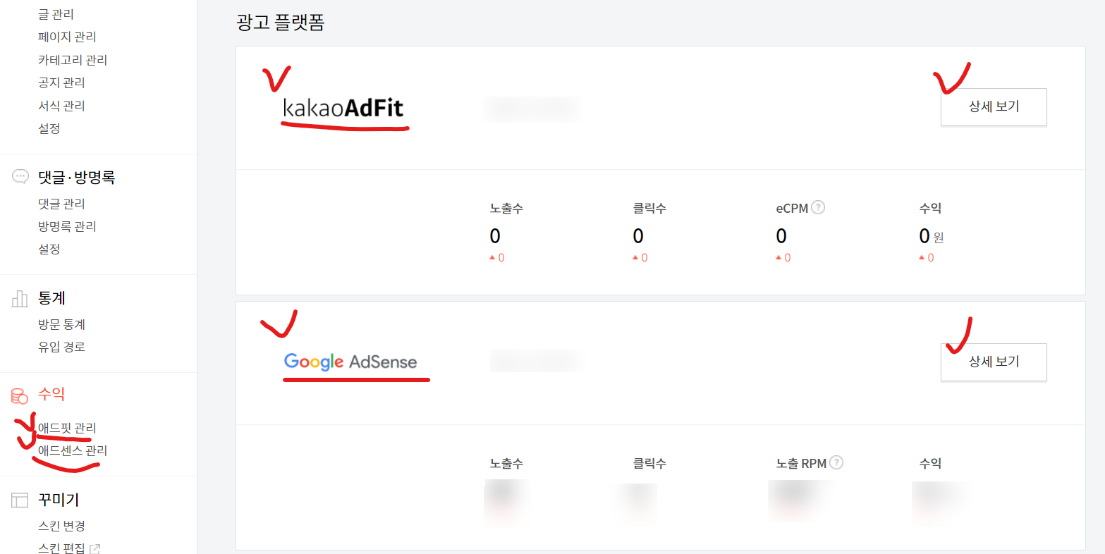 승인이 나면 블로그 관리의 수익 메뉴에서 새로운 메뉴가 생깁니다.
