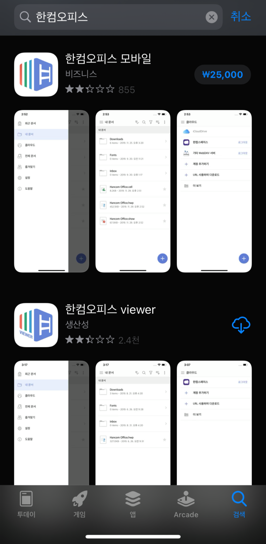먼저 앱스토어에 들어가셔서 한컴오피스를 검색해주세요.