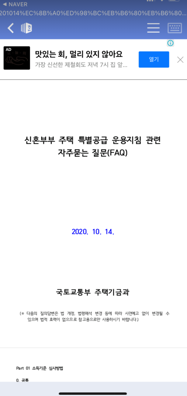 가운데 보이는 201014 신혼부부 주택 특별공급 관련 FAQ를 열어보겠습니다.