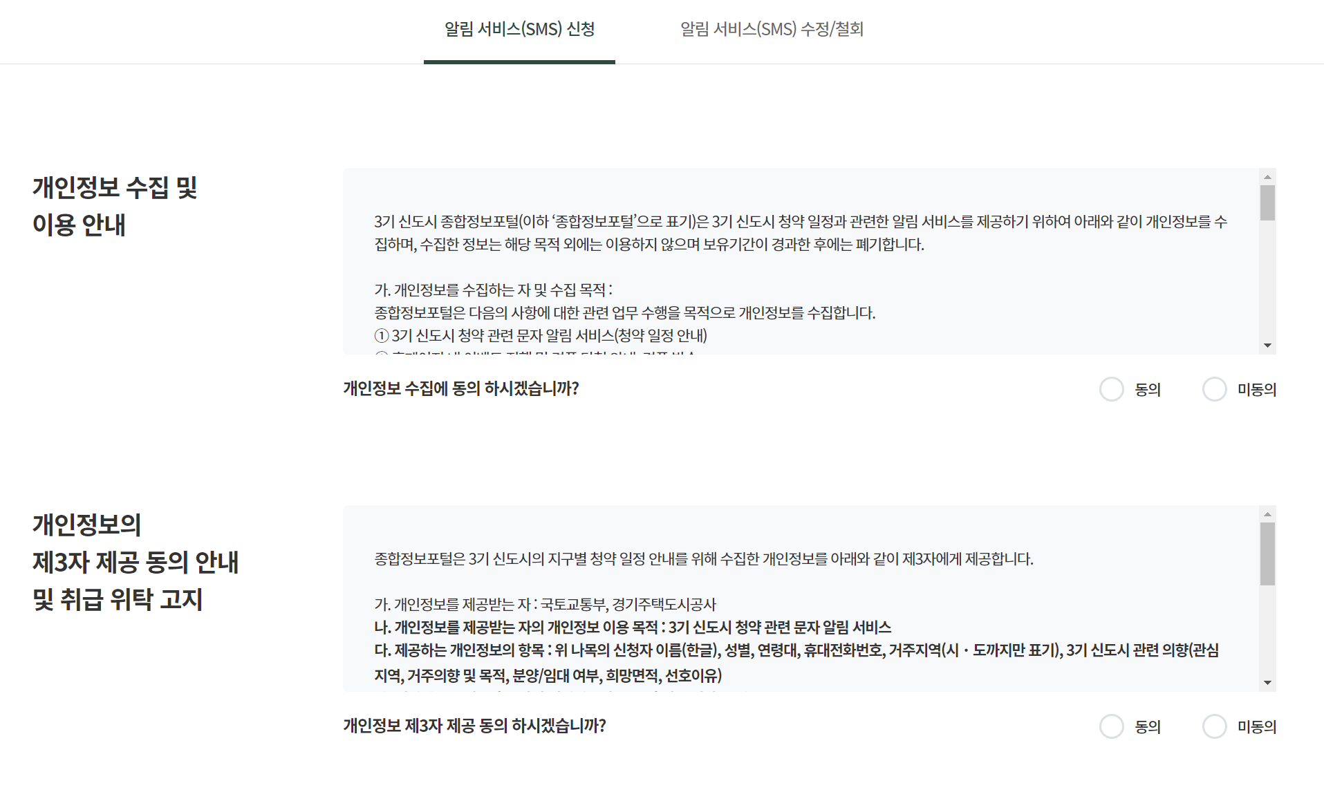 개인정보 수집 동의를 하고, 개인정보를 입력하고 신청하기 버튼을 누릅니다. 그러면 청약일정알리미 신청이 완료됩니다. 사전청약이 시작되면, SMS로 알림이 올 것입니다.