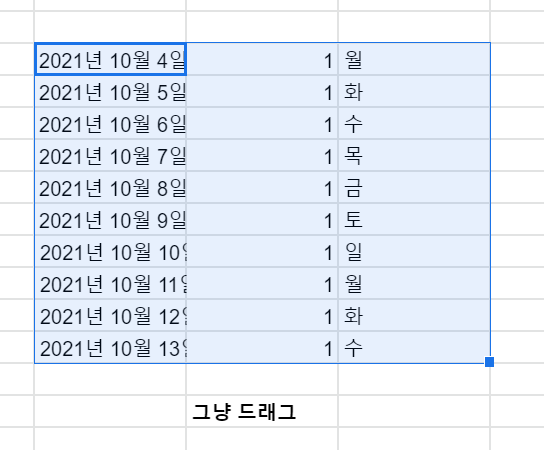 미묘한 차이가 보이시나요? 먼저 첫번째 행인 날짜와 세번째 행인 요일이 그냥 드래그를 했더니 순차적으로 증가합니다. 그러나 컨트롤 키를 누르고 드래그를 하니 동일한 내용이 반복적으로 입력됩니다.