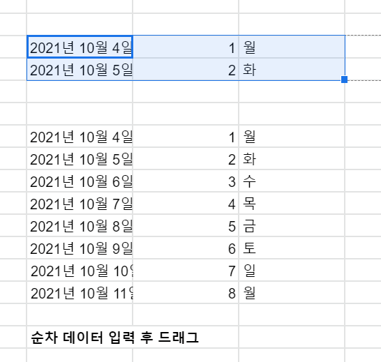그런데 첫번째줄과 두번째줄에 순차 데이터를 입력 후에 드래그를 하면 순차적으로 데이터가 입력이 됩니다.