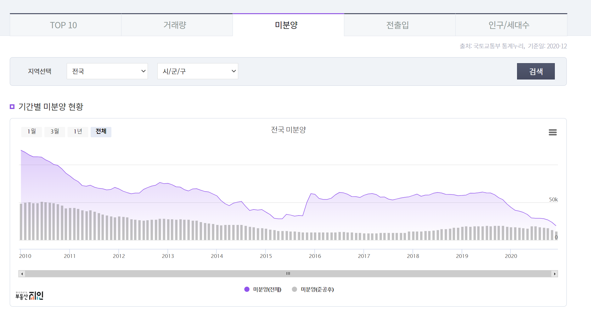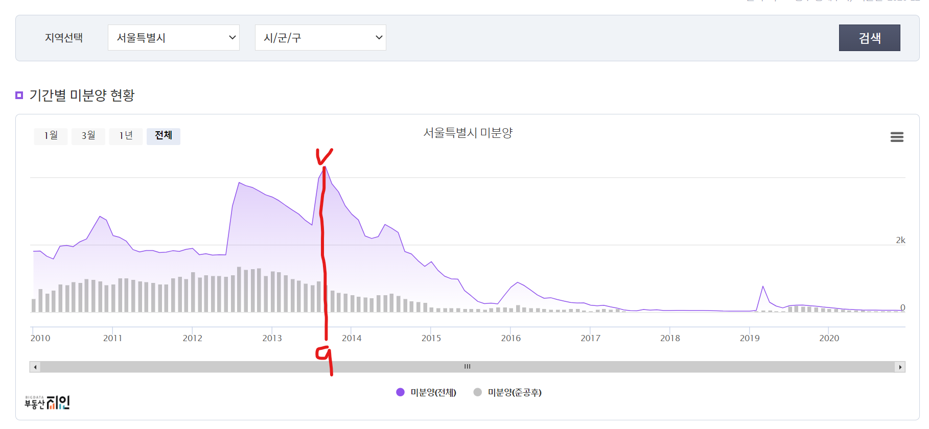 선 그래프는 전체 미분양 물량을 보여주는 것으로 준공 전 즉 청약 이후 미분양이 난 물량을 모두 보이는 것입니다.