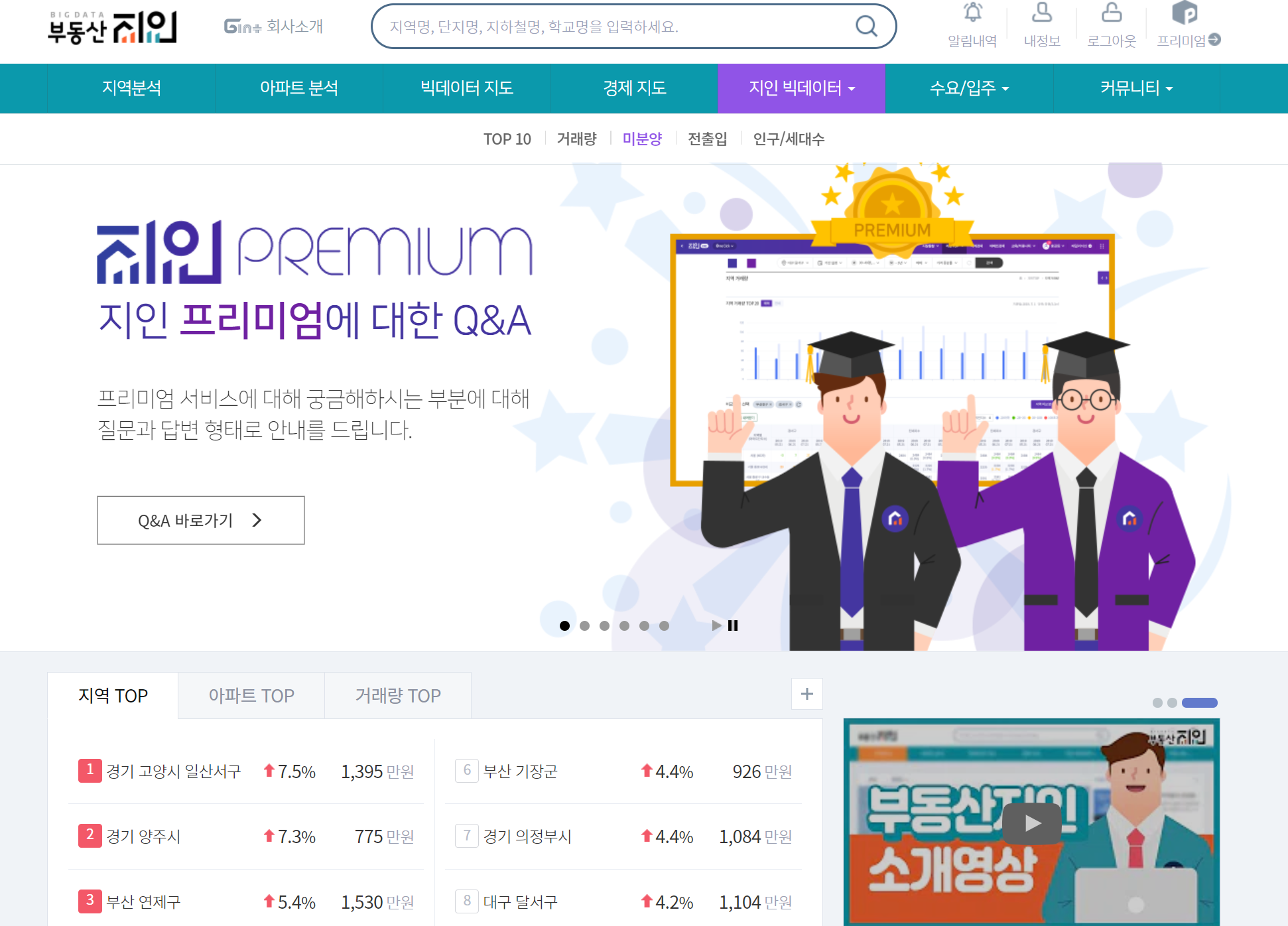 빅데이터가 대세죠. 부동산지인은 바로 빅데이터 분석을 통해 부동산을 분석하는 사이트입니다. 다양한 메뉴가 있는데 오늘은 미분양 물량을 확인하는 방법을 살펴보겠습니다.