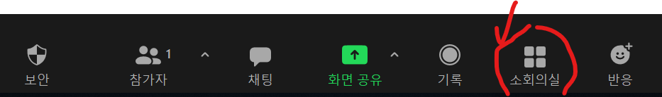 회의를 개설하면, 하단에 메뉴바가 있습니다. 소회의실을 눌러주세요.