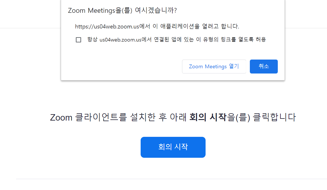 설치 후에 Zoom Meetings 열기 혹은 회의 시작을 눌러주세요.