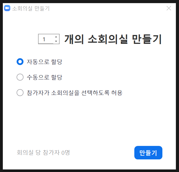 - 자동으로 할당은 만들어지는 소회의실 개수에 따라서 회의 참가자를 자동으로(무작위 랜덤) 할당해주는 기능입니다. 임의의 소집단을 만들고 싶다면 사용하면 좋습니다.