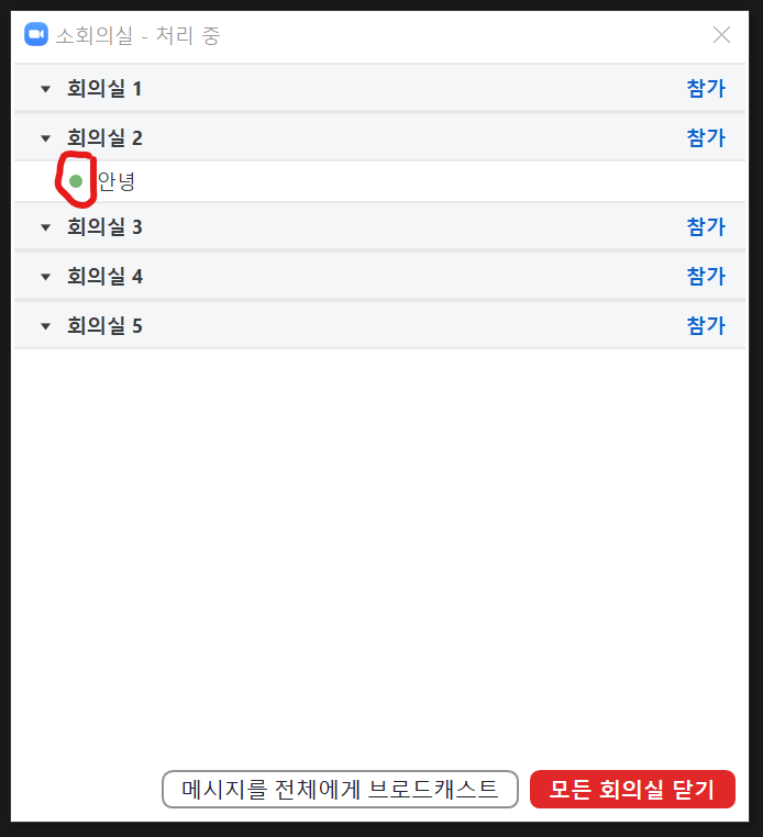 아직 회의 참가자가 회의실 2에 들어가지 않았습니다. 그런데 소회의실 참가 버튼을 누르면 다음과 같이 회의 참가자 앞에 녹색 원이 생깁니다.