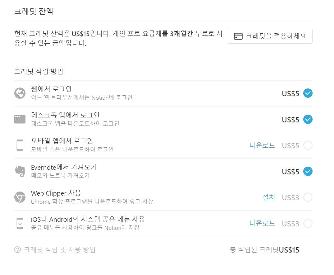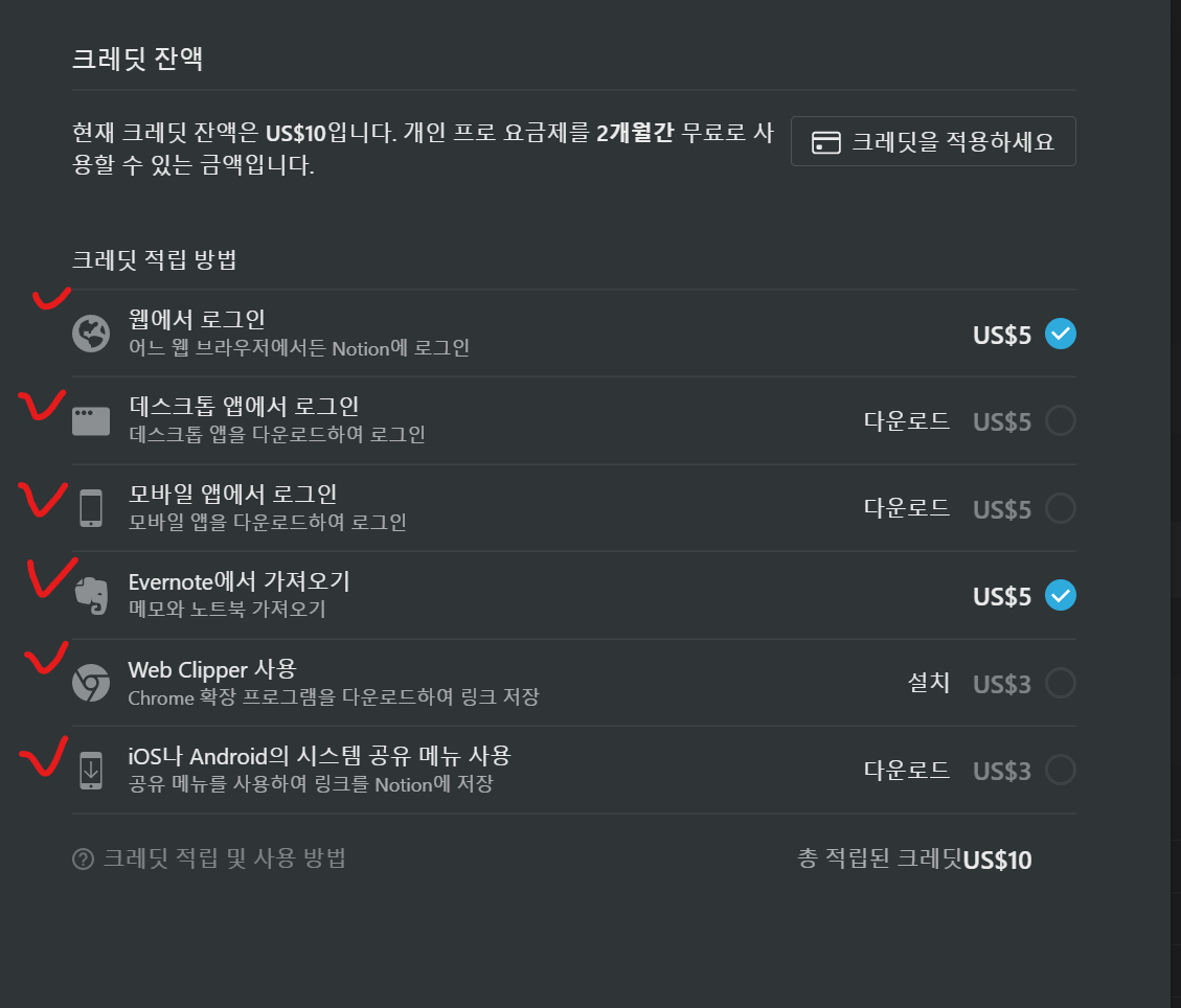 저는 웹에서 로그인을 했고, 에버노트에서 자료를 가져왔기 때문에 10달러가 적립되었습니다.