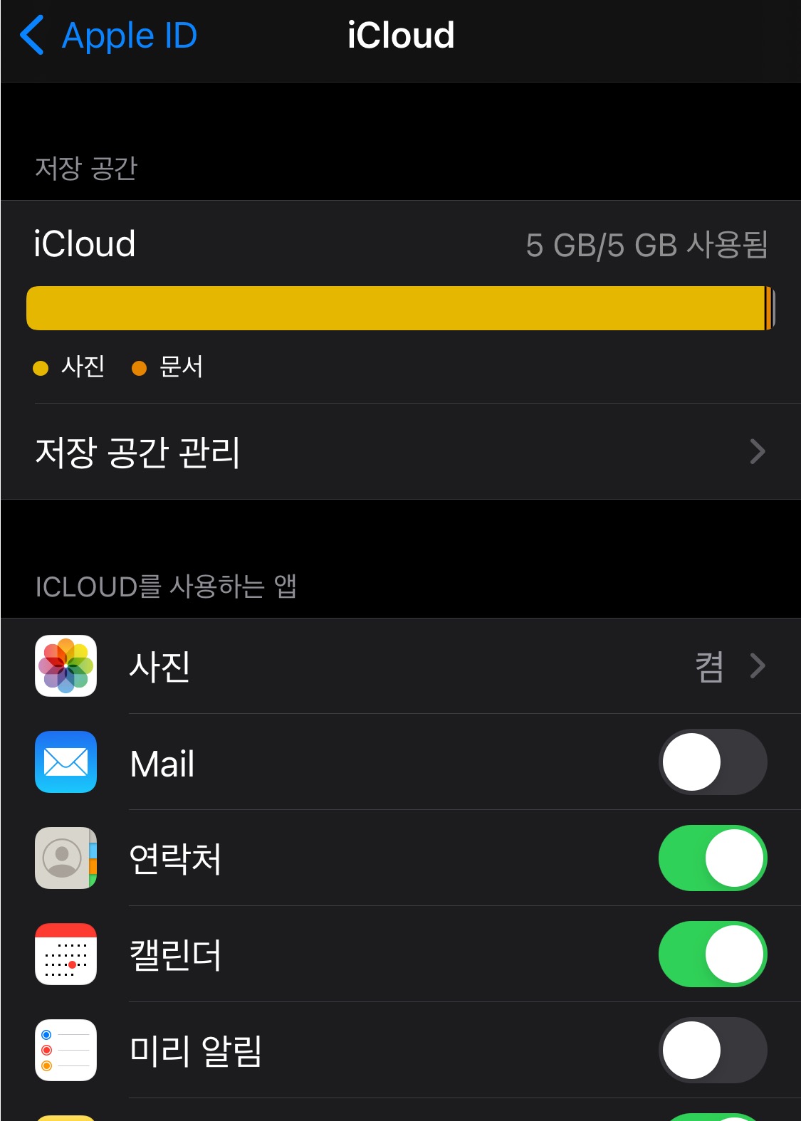 그러면 다음과 같이 아이클라우드 설정 화면이 나옵니다. iCloud - 미리 알림 기능을 활성화해주세요.