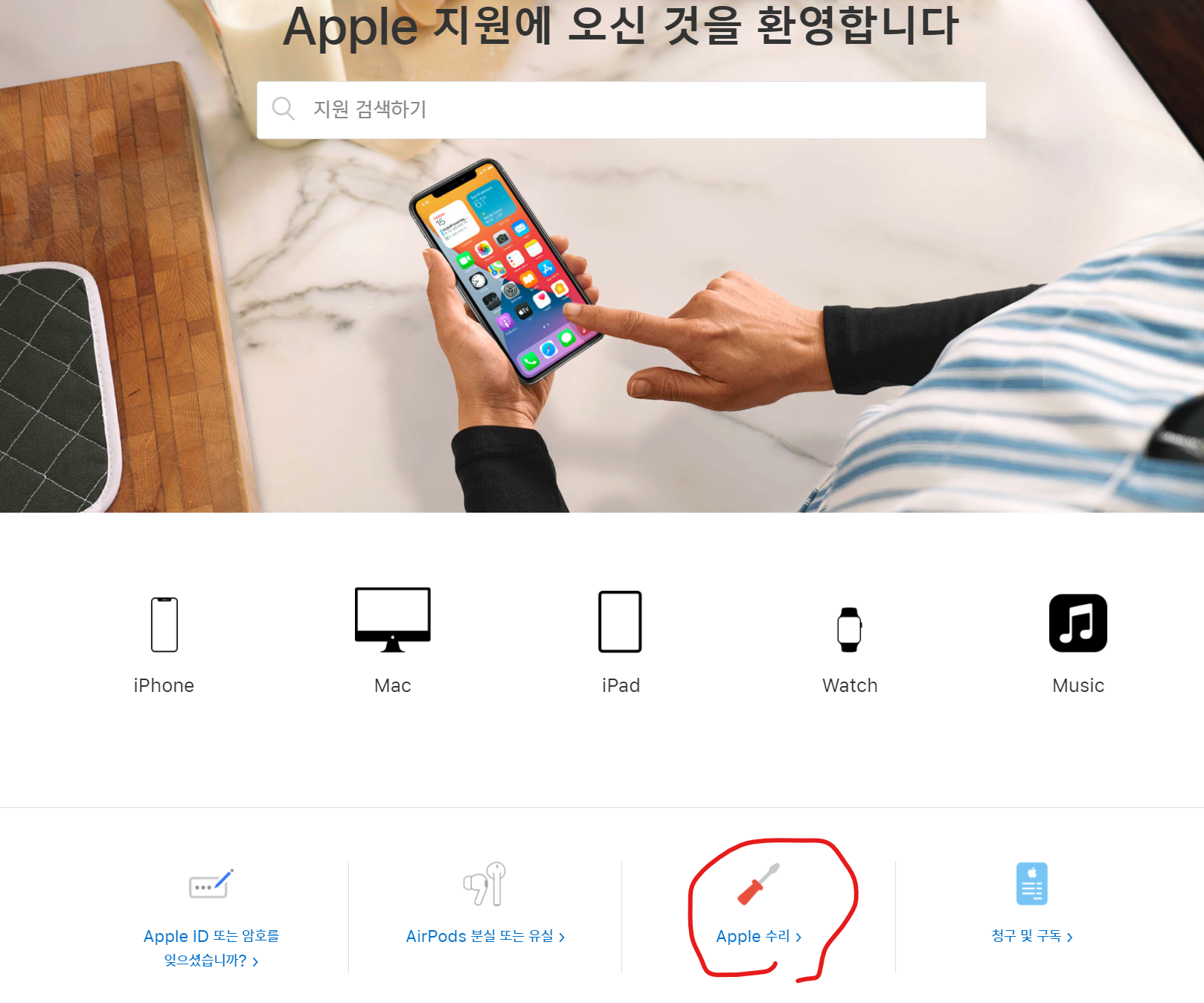 웹 온라인 예약 방법은 support.apple.com/ko-kr 접속하여 수리를 누릅니다.