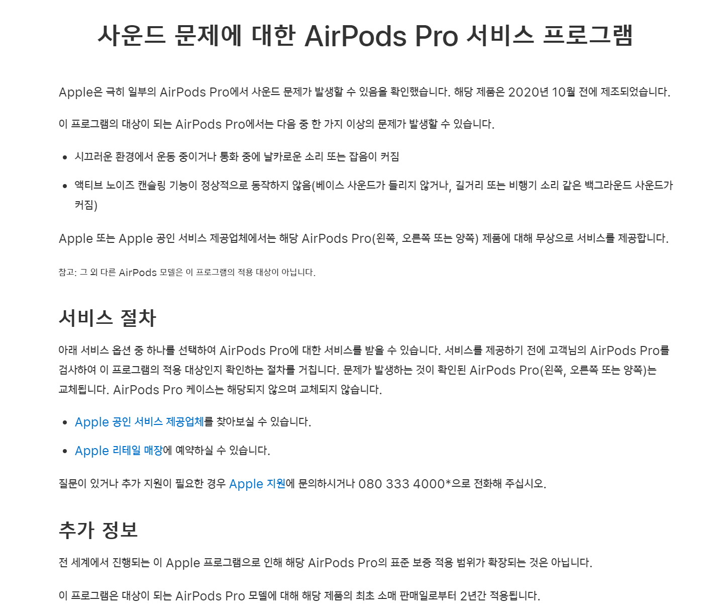 2020년 11월즈음에 에어팟 프로 리콜 관련 기사가 나왔습니다. 애플 공식홈에서는 2020년 10월 30일에 아래와 같이 게시가 되었죠.