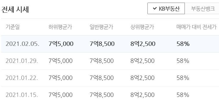 끝으로 위례역 푸르지오 5단지의 현재 전세가2021년 2월 기준)를 살펴보고 이 글을 마치고자 합니다.