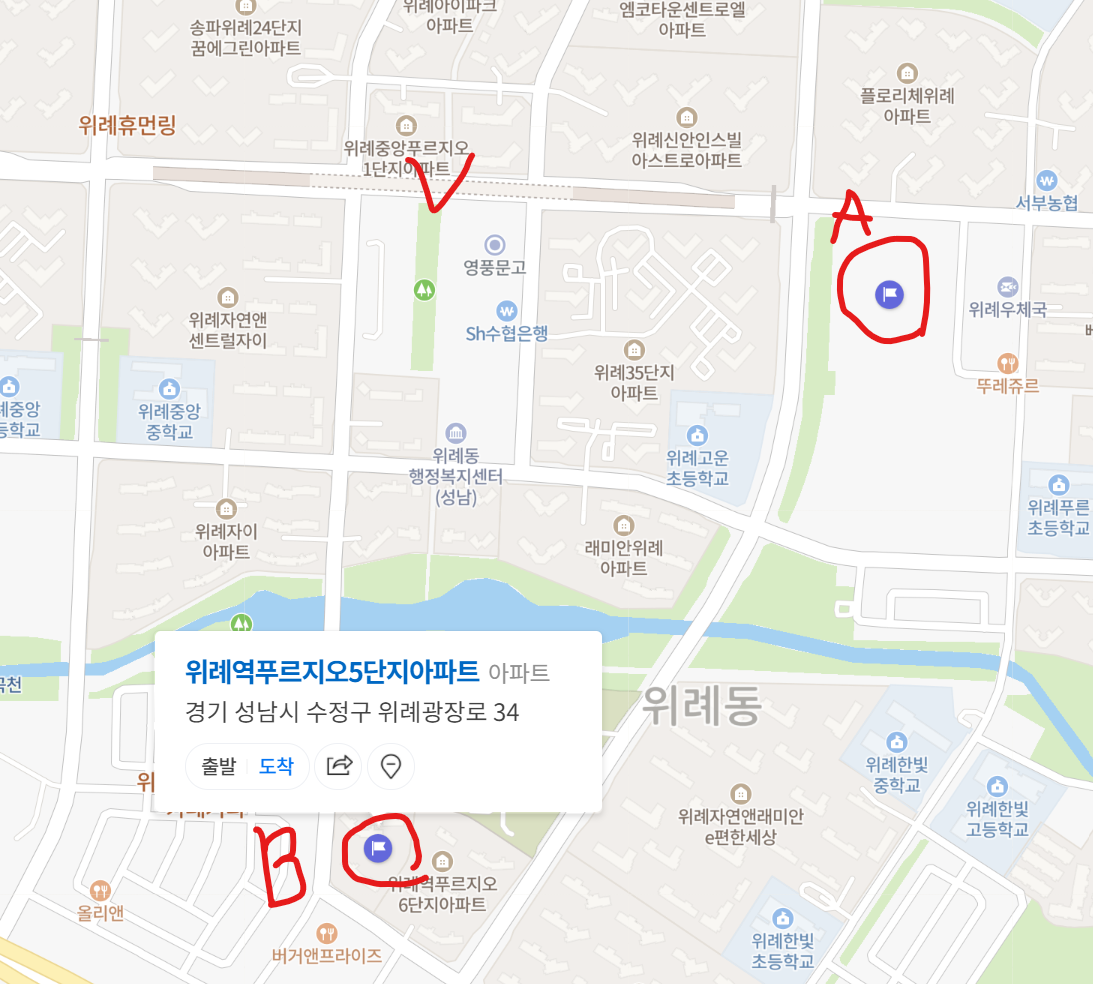오늘의 결론입니다. A가 위례 자이 더 시티, B가 위례역 푸르지오 5단지입니다.
