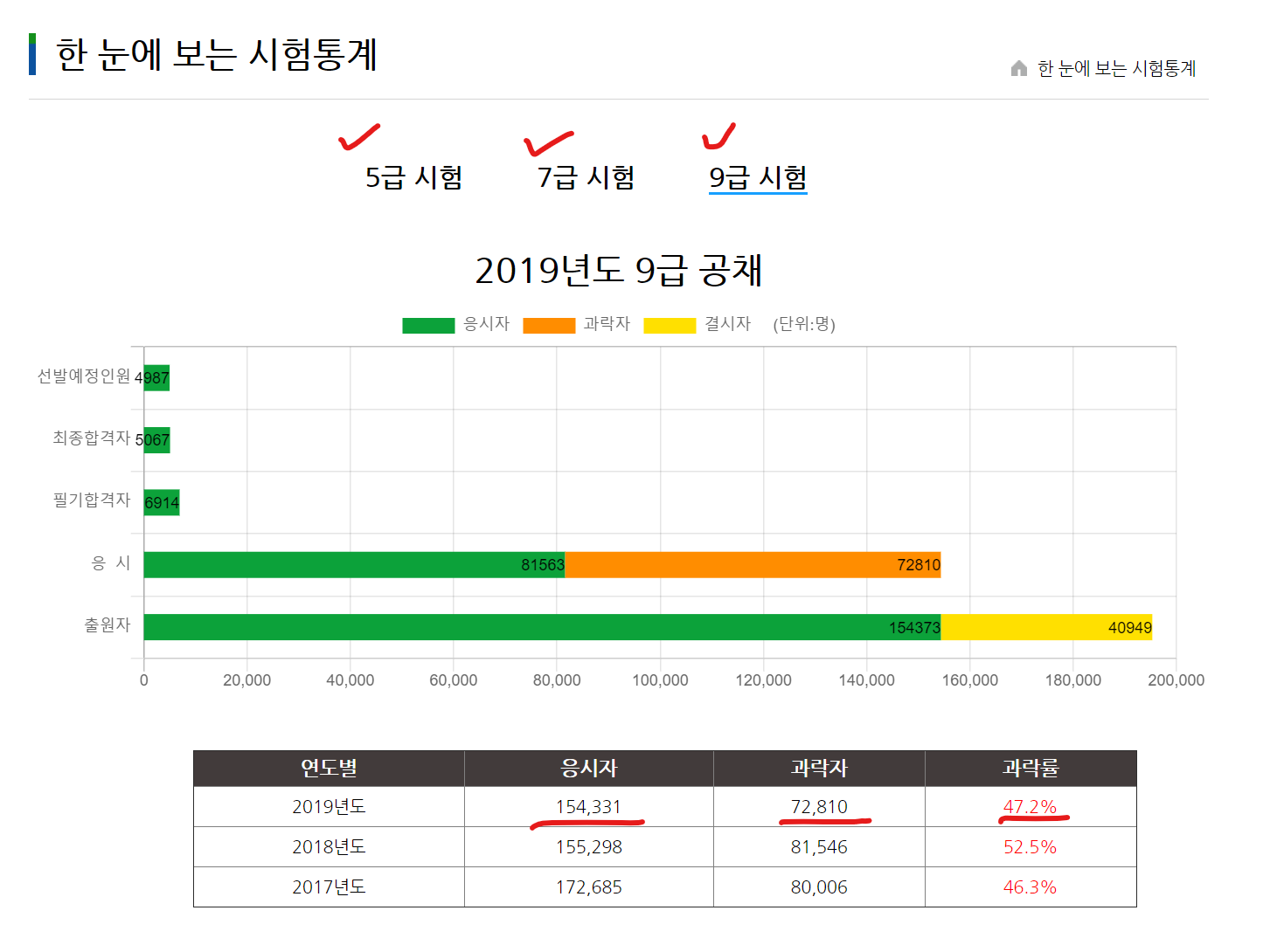 2019년도 9급 응시자는 총 154,331명이었네요. 그런데 과락자 72,810명으로 무려 과락률이 47.2%였습니다.
