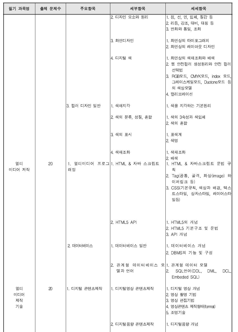 - 필기 1. 멀티미디어개론 2. 멀티미디어 기획 및 디자인 3. 멀티미디어 저작 4. 멀티미디어 제작 기술