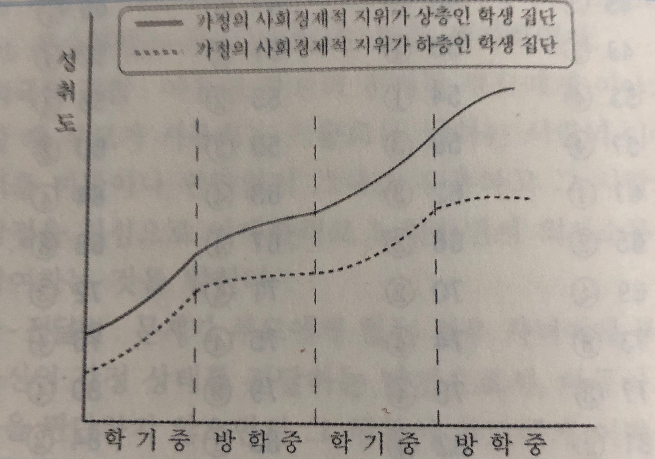 상위 계층과 하위 계층이 학기 중에는 학업 성취도의 증가 기울기가 동일합니다.