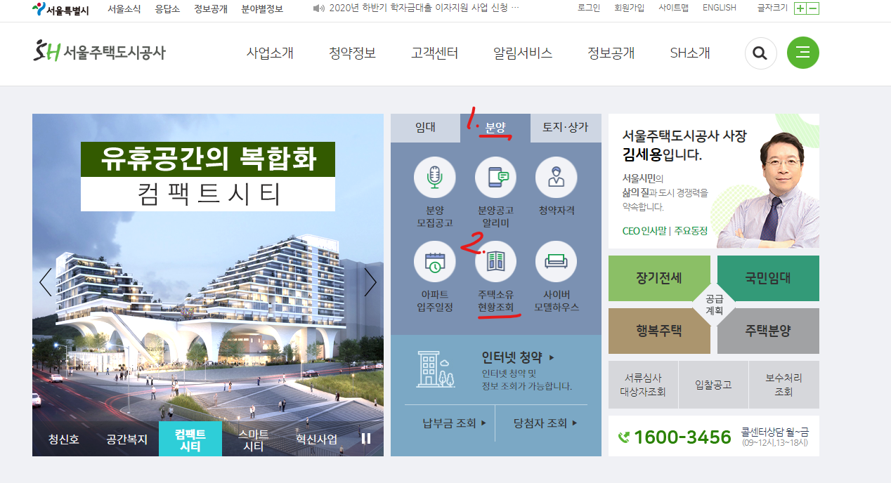 홈페이지에 들어가 보시면 화면 가운데 분양 메뉴가 있습니다. 누르고, 주택소유현황조회를 눌러주세요.