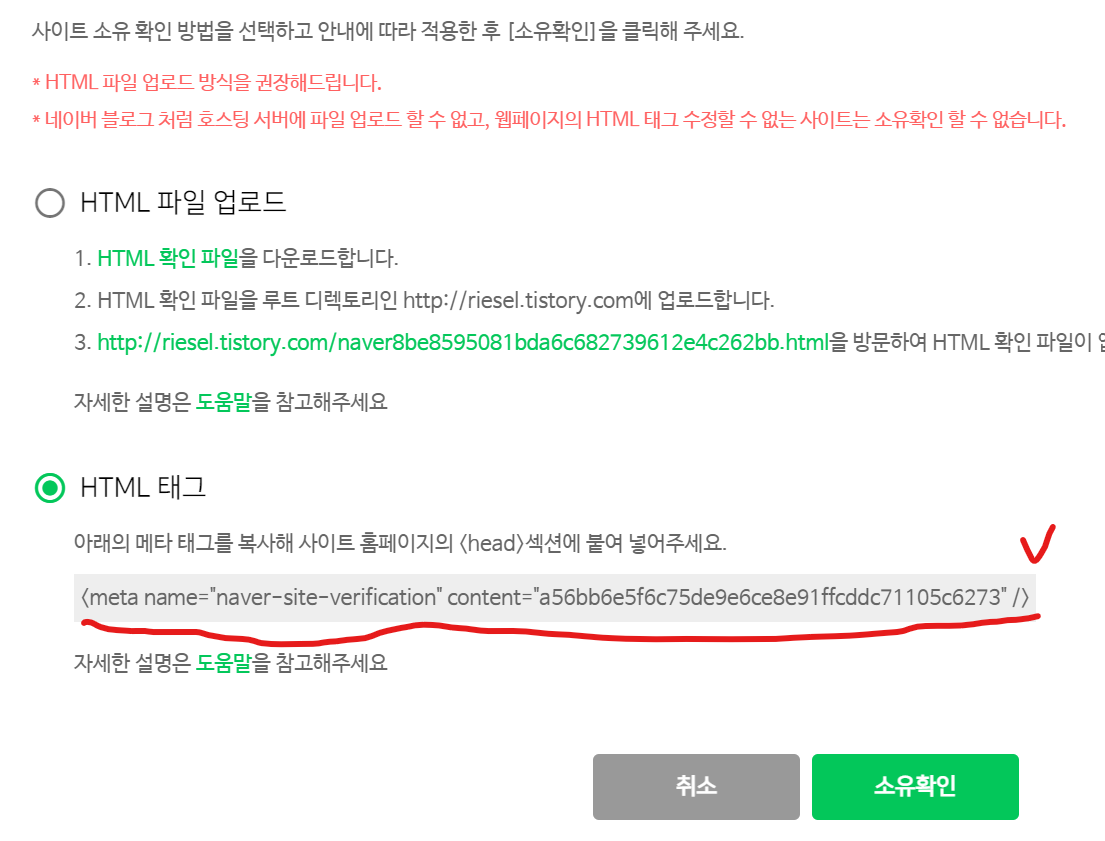 4️⃣ 이런식으로 블로그 주소를 입력하면, 사이트 소유확인이 나옵니다.