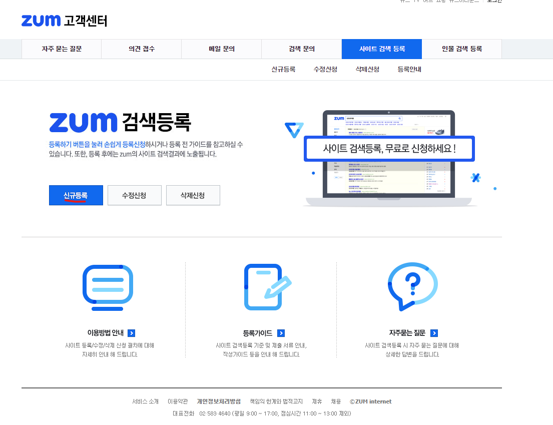 1️⃣ zum 줌은 고객센터에 검색 등록 메뉴가 있습니다. 다음 주소로 접속을 해주세요.