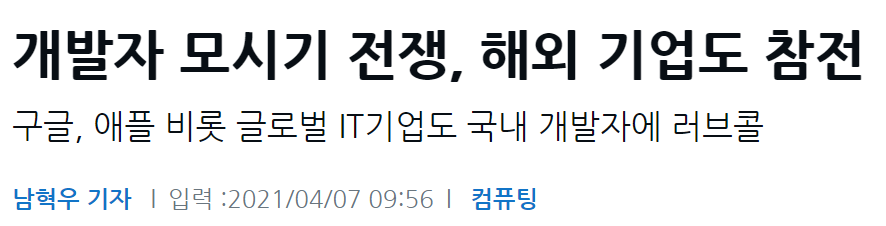 이러한 개발자 채용의 전쟁을 단적으로 보여주는 기사가 아래와 같습니다.