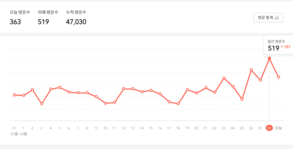 그러던 중 드디어 4월 28일 일일 조회수 500을 돌파합니다.