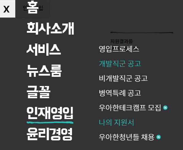 1️⃣ 우아한형제들 홈페이지 인재영입에서 나의 지원서를 아래와 같이 클릭하시면