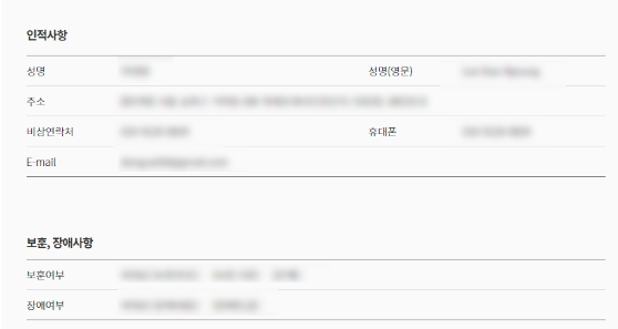 먼저 인적사항과 보훈, 장애사항이 제대로 입력되었는지 확인을 해주세요.