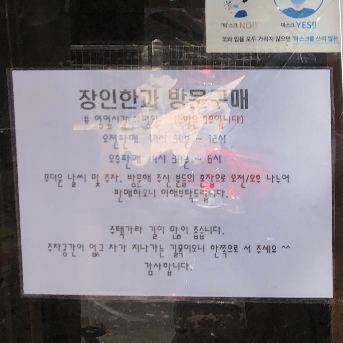 장인한과는 주택가 골목길 바로 옆에 이렇게 좁은 창문에서 판매합니다. 차도 딱 한 대만 지나갈 수 있습니다. 아주 협소한 골목입니다. 안내문에는 오전 판매 10시30분부터 12시까지 나와있지만, 오전 10시에는 가야 구입 가능합니다. 오후 판매는 오후 4시 30분부터라고 나와있지만, 오후 4시 전에 가시기 바랍니다.