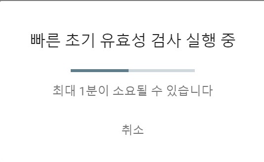 빠른 초기 유효성 검사 실행 중 메시지 창이 나옵니다. 최대 1분이 소요될 수 있다는 안내 메시지가 함께 나옵니다.