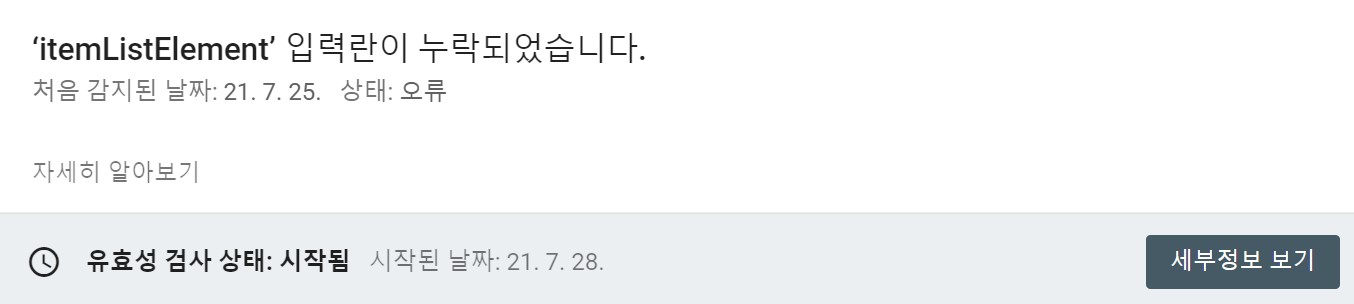 그리하였더니 위처럼 구글 서치 콘솔 itemListElement 입력란이 누락되었습니다 유효성 검사 상태: 시작됨 메시지로 전환되었음을 확인할 수 있었습니다. 즉 문제가 해결된 것입니다. 유효성 검사는 최대 1일 이상 걸린다고 합니다. 검사가 끝나면 메일로 알림이 날라올 것입니다.