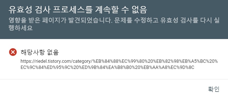 이렇게 조치를 취한 후에 구글 서치 콘솔에서 수정 결과 확인 버튼을 눌러보았습니다.