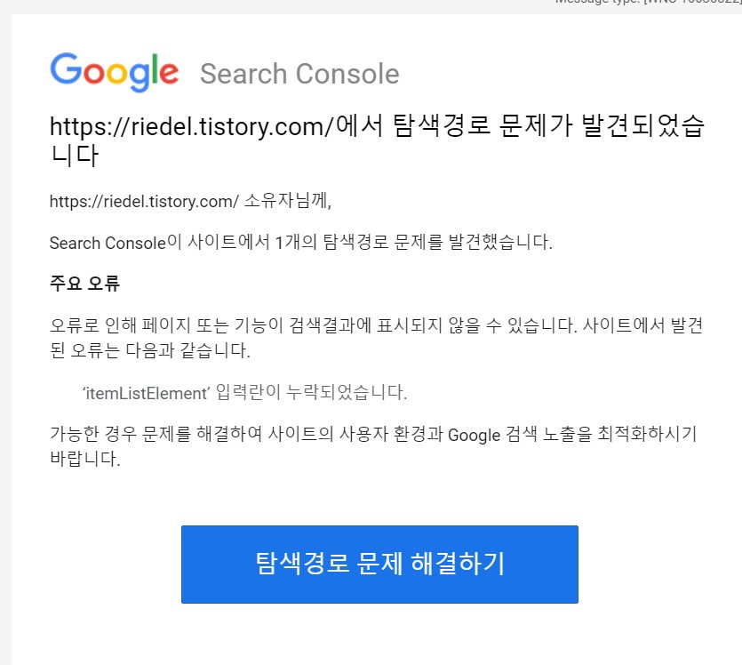 구글서치콘솔에서는 종종 오류가 생겼다며 메일이 날아옵니다. 이번에는 itemListElement 입력란이 누락되었다는 메시지입니다.