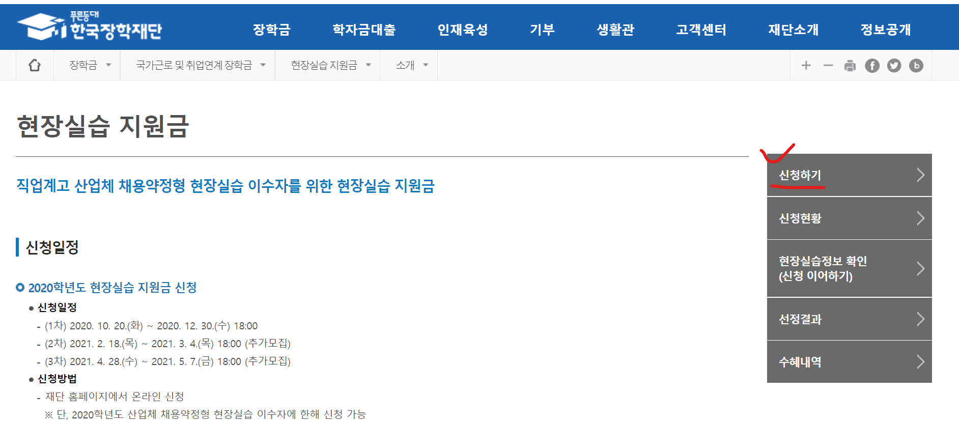 2021년 7월 현재 홈페이지 최신화가 이루어져 있지 않습니다. 2020학년도 현장실습 지원금 신청 일정이 나와 있습니다. 작년 일정을 참고로 2021년 현장실습 지원금 신청 일정을 예측할 수 있습니다. 2021년 9월에 한국장학재단 신청 시스템 오픈 예정입니다. 2021년부터는 모바일로도 신청 가능합니다.
