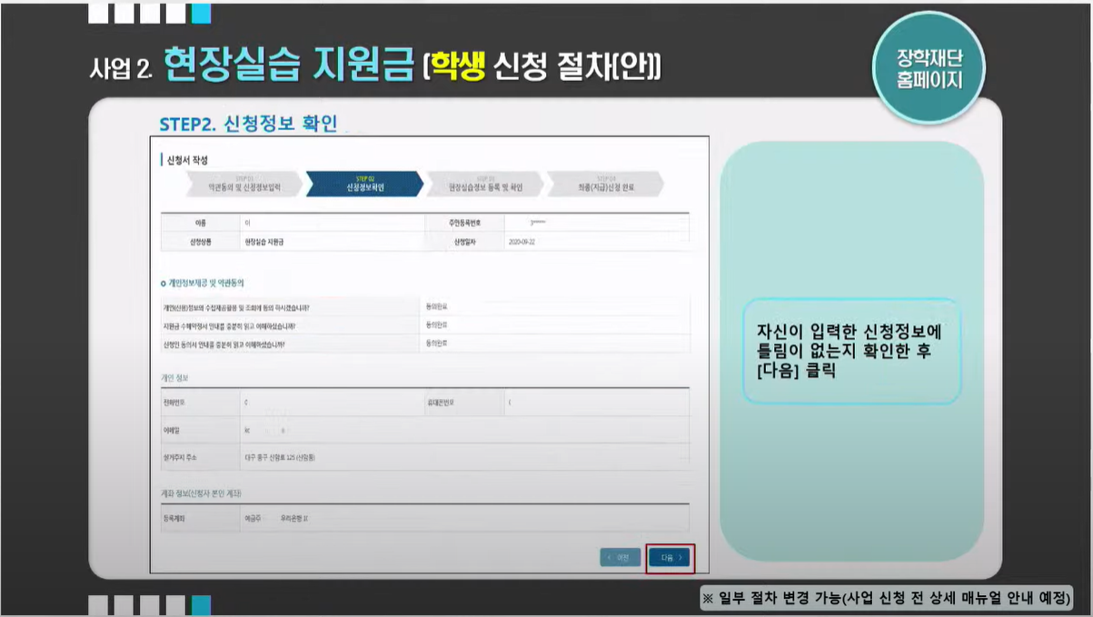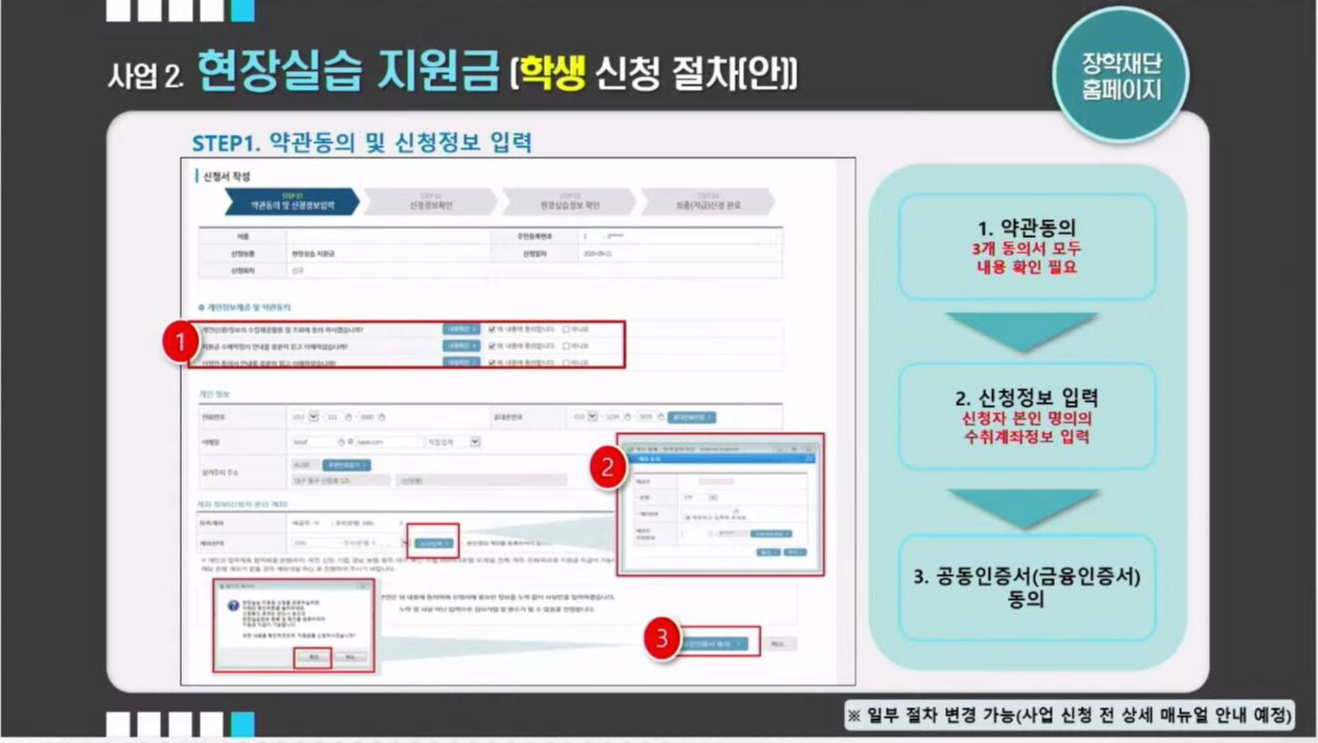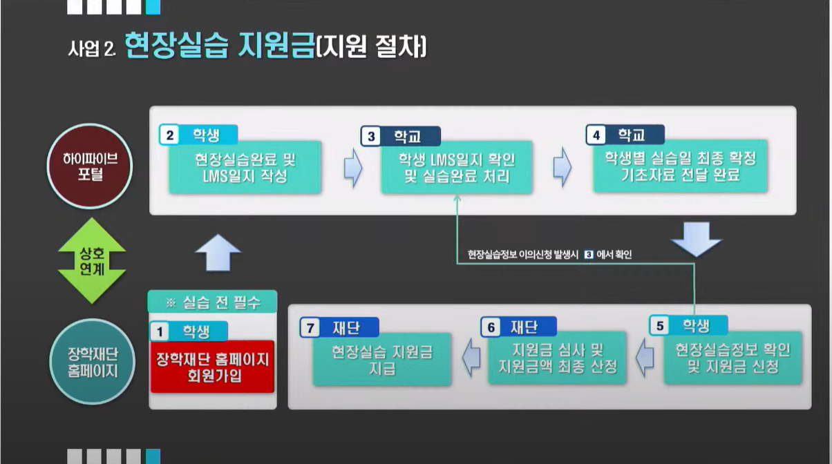 - 한국장학재단 홈페이지에서 현장실습정보 확인 및 지원금 신청