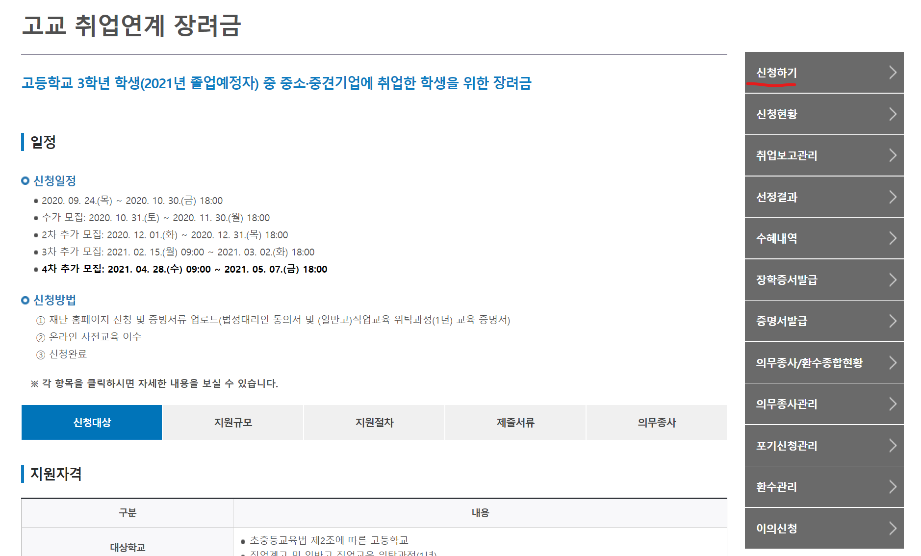 고교 취업연계 장려금에서 신청하기를 눌러주세요.