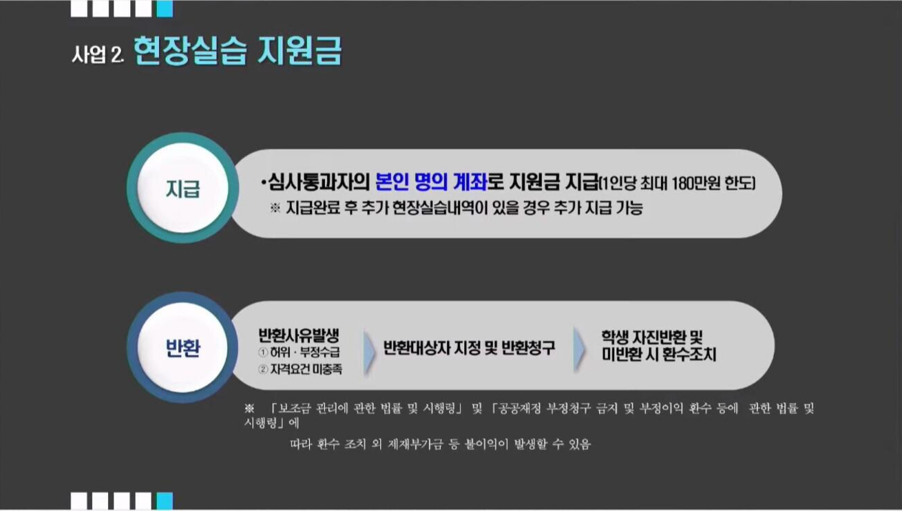 - 지급방식 : 현장실습 종료 건별로 수시 지급
