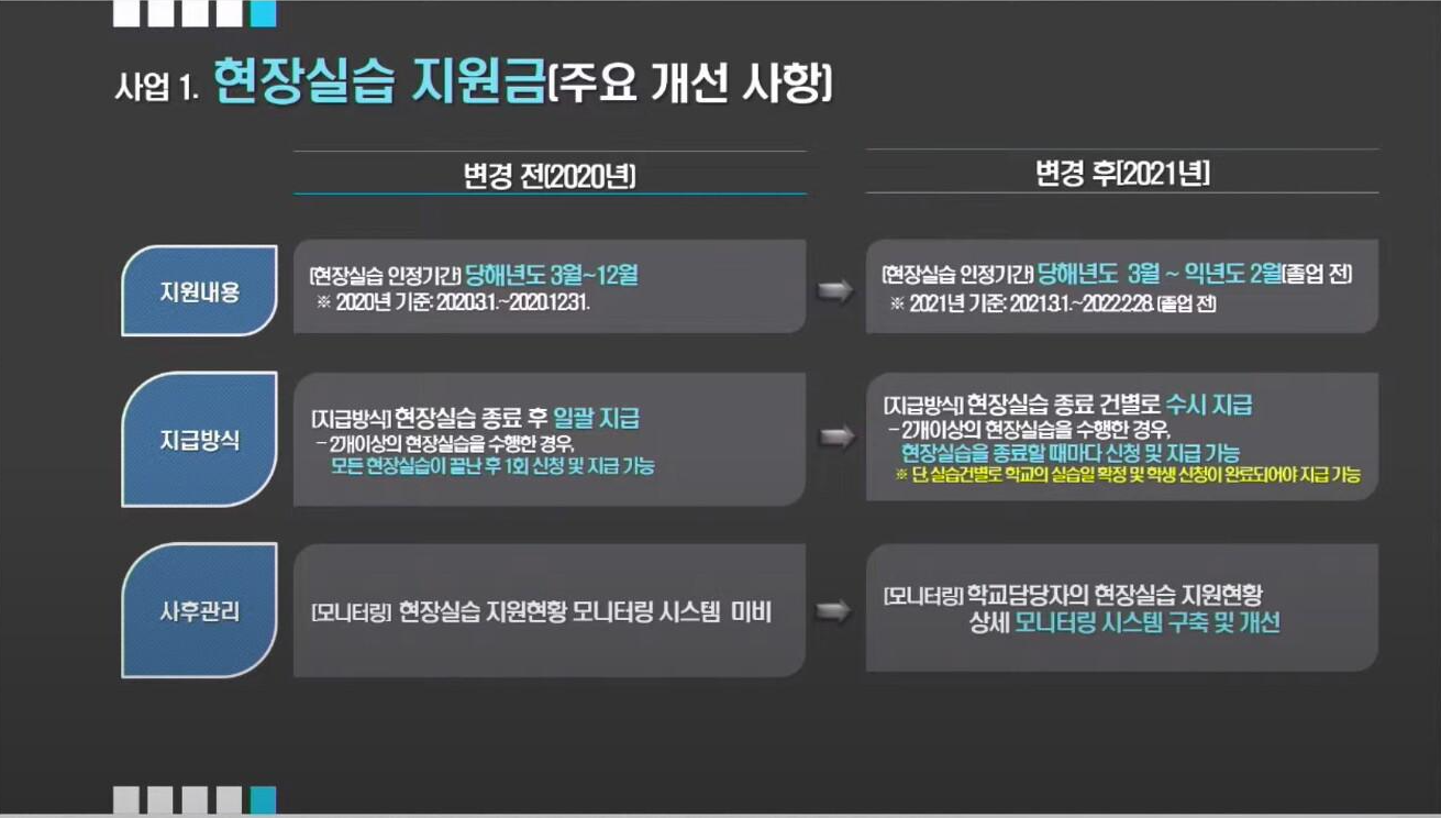 2021 현장실습 지원금 주요 변경 사항은 다음과 같습니다.