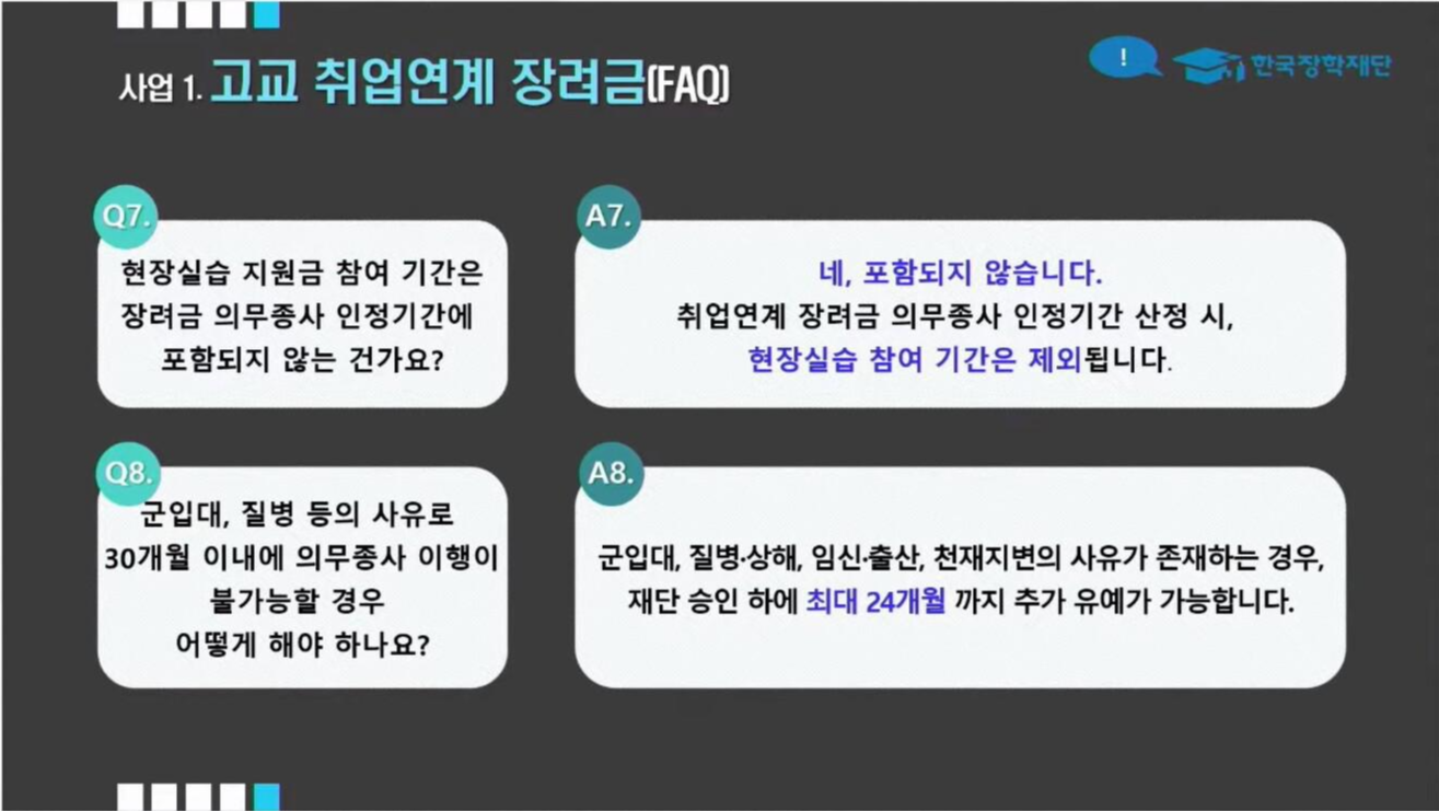 - 고교 취업 연계 장려금 의무종사 기간에 현장실습 참여 기간은 제외됩니다.