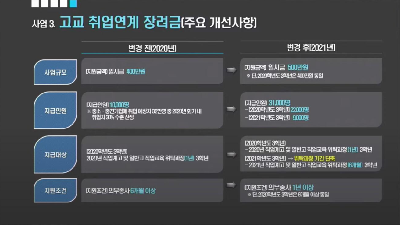 - 지급대상 : 2021년 직업계고 및 일반고 직업교육 위탁과정(6개월 이상) 3학년