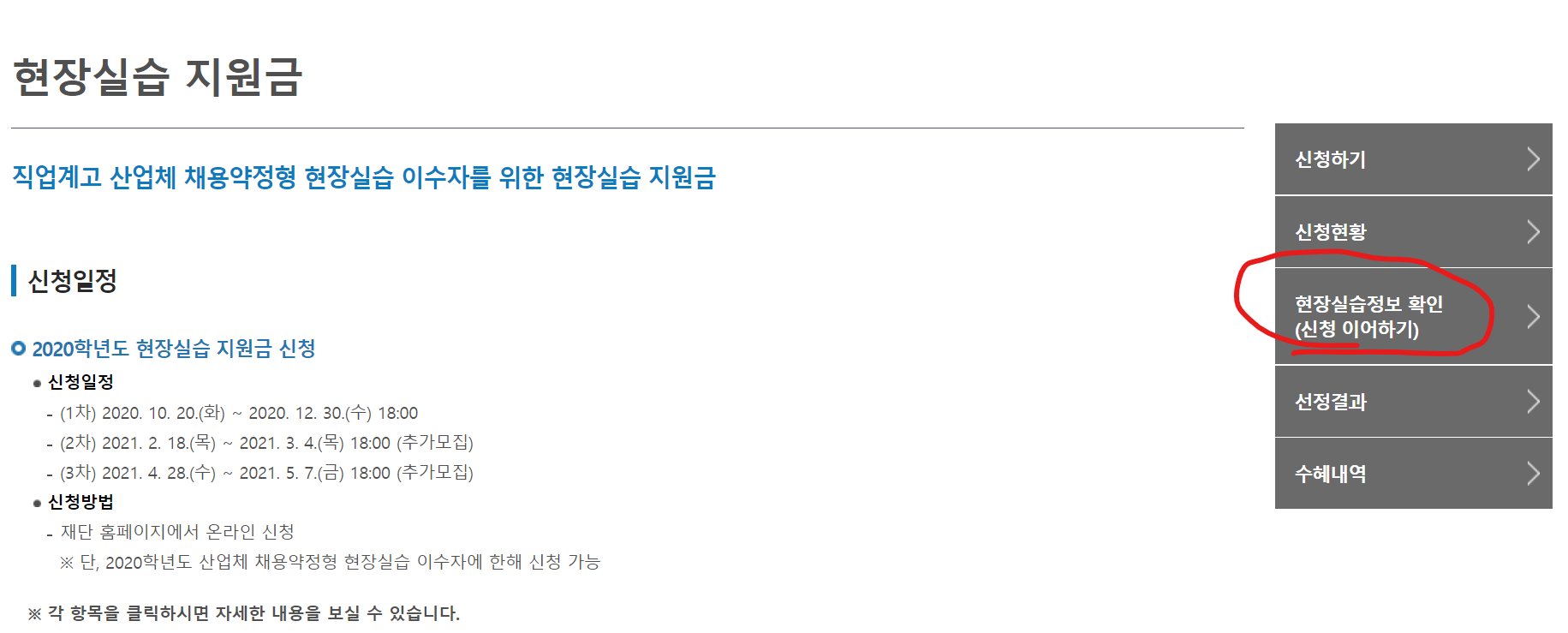 - 한국장학재단 - 장학금 - 국가근로 및 취업연계장학금 - 현장실습 지원금 - 현장실습정보 확인(신청 이어하기)