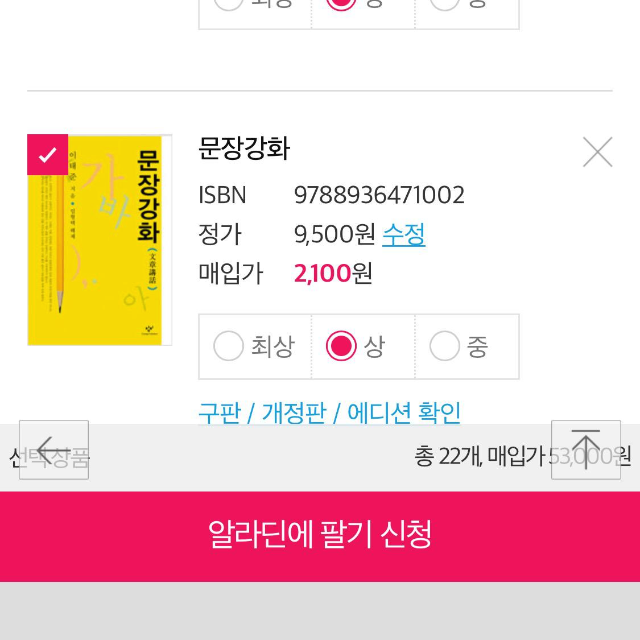 매입 가능하면 이제 책 상태에 따라 가격이 정해집니다. 단, 책 상태가 좋아도 재고가 많으면 매입 불가되기도 합니다.