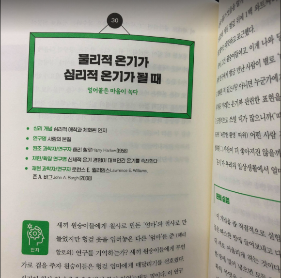 챕터 30은 흥미로운 주제를 담고 있습니다. 따뜻한 아메리카노와 아이스 아메리카노의 온도가 과연 상대방을 인지하는데 영향을 줄까요? 이에 대한 심리학 실험 연구 결과를 제시하고 있는데요.